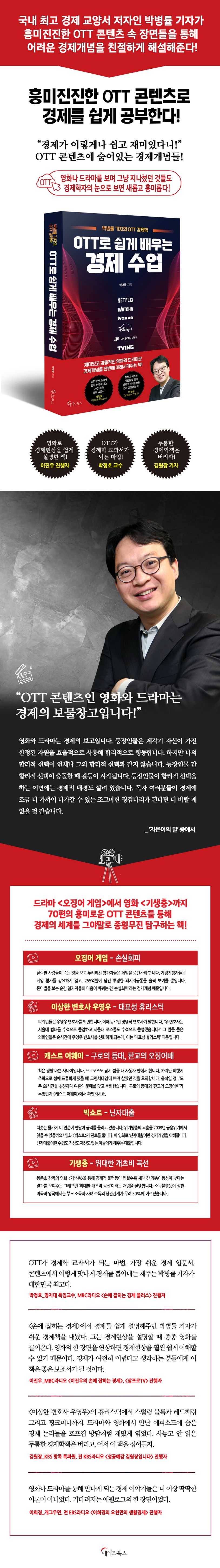 풍요로운 여가를 위해서, 혹은 대화에 끼기 위해서라도 넷플릭스, 왓챠, 디즈니+, 티빙, 웨이브, 쿠팡플레이 등의 OTT를 방문해 콘텐츠를 시청하는 게 매일의 필수 습관이 된 현대인들에게 너무나 안성맞춤인 경제 교양서이다. 국내 최고 경제 교양서 저자인 박병률 기자가 흥미진진한 OTT 콘텐츠들의 생생한 장면들을 통해 어려운 경제개념을 친절하게 해설해주는 책이다. 이 책은 OTT 콘텐츠 속 인물과 장면을 통해 경제에 대한 이야기를 술술 풀어내며, 우리가 사는 세상을 경제적 관점에서 바라보고 이해하게끔 도와준다. 저자는 영화, 드라마 등 OTT 콘텐츠야말로 경제의 보고라고 말한다. 이 책은 어렵게만 느껴지는 경제학용어들을 독자들이 조금이라도 더 쉽고 재미있게 이해할 수 있도록 OTT 콘텐츠라는 맛깔난 코드를 끌어들인다. 흥미로운 OTT 콘텐츠 내용에 푹 빠져 읽다 보면 어느새 경제용어를 소화한 자신을 발견할 수 있을 것이다.