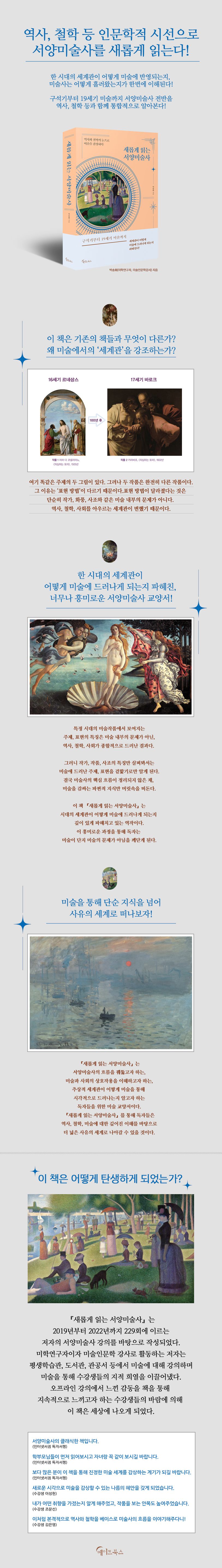 이책은총7장으로구성되어있다.1장은원시미술을설명한다.원시미술은구석기미술과신석기미술로이루어져있다.구석기미술은인류최초의미술로목표의시각화에대해서살펴본다.신석기미술은최초의추상화로구상과추상이반복되는미술의세계를들여다본다.2장은고대미술로이집트미술,그리스미술,헬레니즘미술,로마미술로이루어져있다.이집트미술은이집트의역사속에서재현되는추상을들여다보고그리스미술은민주주의의탄생을미술을통해살펴본다.헬레니즘미술로는도시국가와제국을알아보며로마미술에서는생활밀착형이된미술을알아본다.3장은중세미술이다.중세미술은권력에따른표현방식의변화를살펴보며현대적양식인고딕의탄생과세계관을살펴본다.4장은르네상스와그이후의미술사에대해알아본다.르네상스는신에서인간으로시각이변화되며전인적인간이등장한다.전인적인간의등장으로마사초,다빈치,라파엘로의미술을살펴본다.이어서북유럽르네상스에서는베이던,판에이크와캉팽,뒤러의그림을들여다볼것이다.매너리즘에서는16세기시대상과함께미켈란젤로,라파엘로와파르미자니노,엘그레코,틴토레토의작품에서드러나는몽롱하고나른한매너리즘화풍을살펴본다.