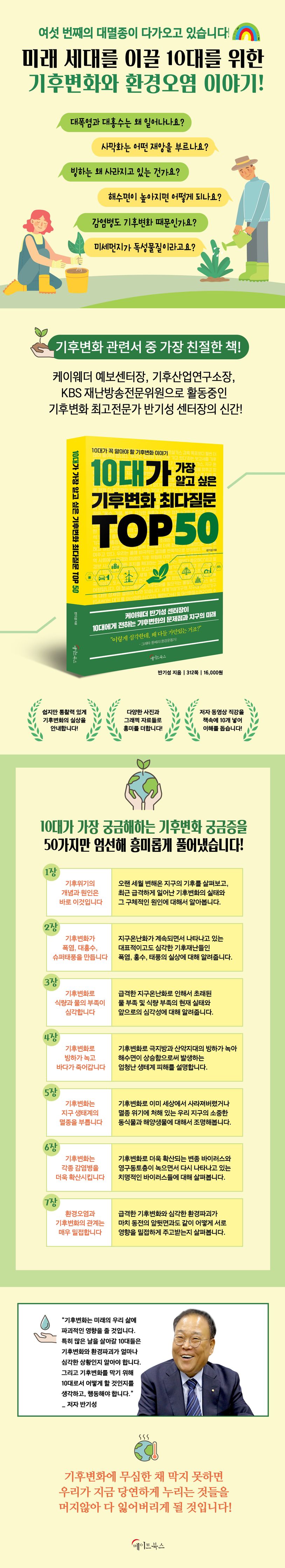 이 책은 케이웨더 반기성 센터장이 다정한 말씨로 재미있게 들려주는 기후변화 이야기로, 오늘날의 10대가 꼭 알아야 하는 기후변화에 관한 것을 모두 담았다. 기후변화가 극심해진 원인은 무엇이며 그로 인해 어떤 문제가 발생하는지 구체적으로 설명한다. ‘기후변화의 원인은 자연인가요, 인간인가요?’ ‘북극권 빙하가 계속 녹으면 무슨 일이 생기나요?’ ‘다음 팬데믹은 코로나19보다 더 위험할까요?’ 등 10대가 가장 궁금해하는 기후변화 관련 궁금증을 50가지로 정리해 흥미롭게 풀어냈다.