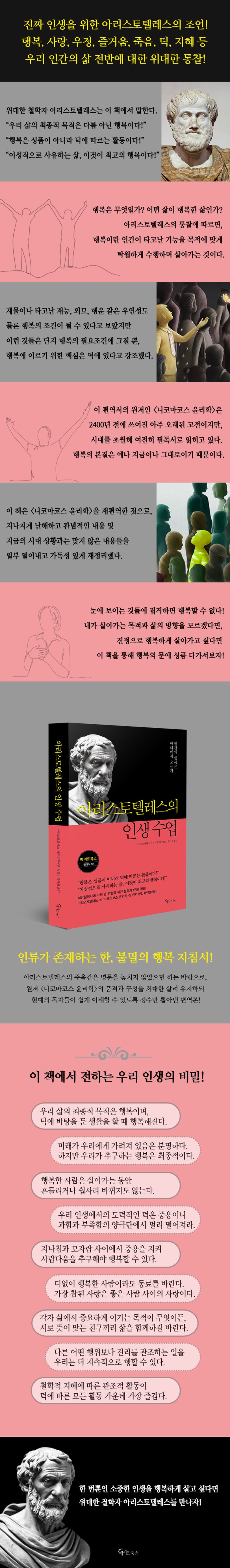 〈니코마코스 윤리학〉은 2400년 전에 쓰였지만, 실천적 지혜와 실생활에서의 지식을 강조한다는 점에서 시대를 초월해 여전히 읽히고 있다. 이 책은 〈니코마코스 윤리학〉을 총 9장으로 구성해 행복을 찾아 방황하고 있는 현대인들에게 꼭 필요한 내용을 실었다. ‘인간은 행복해지기 위해 태어났다’라는 사실을 전제로 행복을 어떻게 얻는지, 덕의 종류에는 무엇이 있는지, 인생의 모든 진리가 담겨 있다. 인생을 잘 산다는 것이 무엇인지, 행복한 삶이란 게 무엇인지를 묻는 이들에게 아리스토텔레스는 행복의 정의부터 시작해 용기와 절제, 덕, 지혜, 지성, 자제력, 사랑과 우정에 관한 진리를 이야기한다. 그리고 ‘영원불변하는 진리를 탐구하는 관조적 삶’이야말로 최선의 행복임을 설파한다.