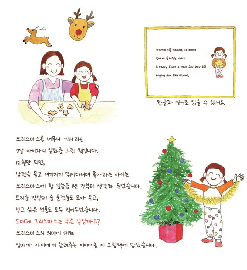 크리스마스를 너무나 기다리는 7살 아이와의 일화를 그린 책입니다. 12월만 되면, 달력을 들고 여기저기 뛰어다니며 좋아하는 아이는 크리스마스에 할 일들을 1년 전부터 생각해 두었습니다. 트리를 장식해 줄 물건들도 모아 두고, 받고 싶은 선물도 모두 적어두었습니다. 도대체 크리스마스는 무슨 날일까요? 크리스마스의 의미에 대해 엄마가 아이에게 들려주는 이야기를 이 그림책에 담았습니다.