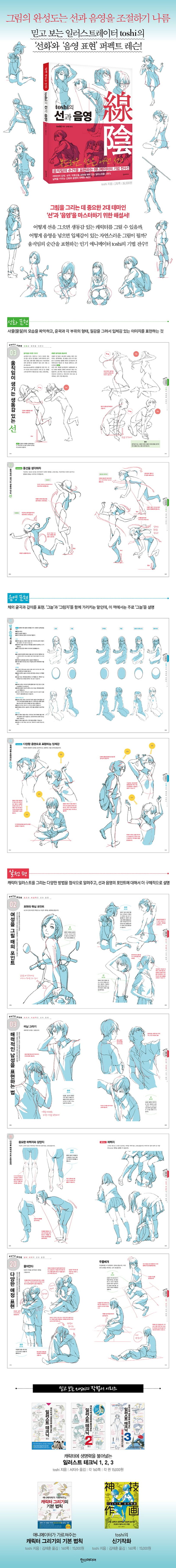 그림을 그리는 데 중요한 2대 테마인 ‘선’과 ‘음영’을 마스터하기 위한 해설서로, 어떻게 선을 그으면 생동감 있는 캐릭터를 그릴 수 있는지. 어떻게 음영을 넣으면 입체감이 있는 자연스러운 그림이 되는지 매일 그림과 사투를 벌이고 있는 분들이 꼭 알았으면 하는 내용을 담았습니다.