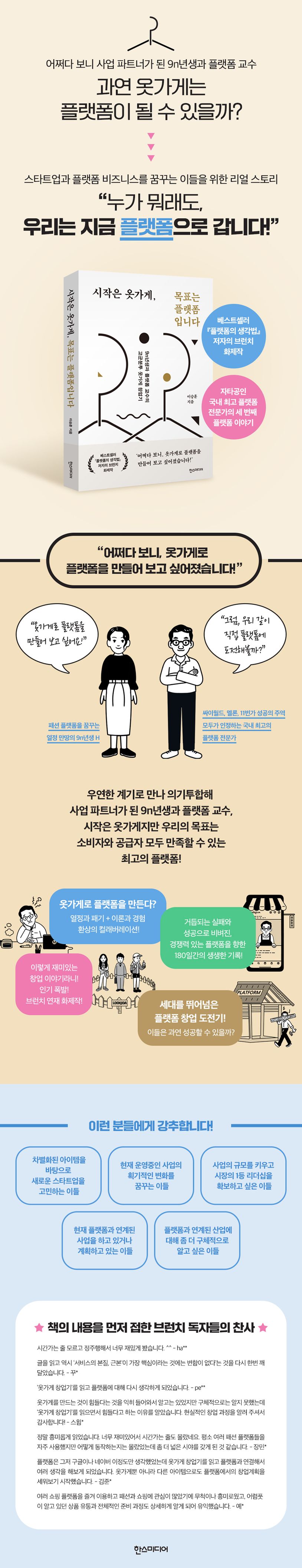 베스트셀러 『플랫폼의 생각법』 『구독전쟁』 등으로 국내 최고의 플랫폼 전문가로 다시금 인정받은 이승훈 교수가 이번에는 보다 더 새로운 관점에서 플랫폼 산업을 들여다본다. 기업에서는 플랫폼 사업의 책임자이자 리더로, 대학에서는 교육자로, 일상에서는 여느 사람들과 다를 것 없는 사용자로서 플랫폼 기업들과 관계를 맺었다면 이 책 『시작은 옷가게, 목표는 플랫폼입니다』에서는 직접적인 공급자가 된 것이다. 더군다나 본인이 인정하기로, ‘1도 모르는’ 패션 시장에 90년대 생 창업 지망생 H와 손을 잡고서 말이다. 저자는 쇼핑몰 기획부터 사이트 제작, 결제수단 설치, 상품 구입과 검수, 배송 그리고 고객 응대까지 모든 실무를 직접 몸으로 부딪히며 현재 플랫폼 산업의 명과 암, 앞으로의 가능성과 한계점을 실감한다. 세대와 성별까지 다른 사업 파트너들과 함께하며 크고 작은 어려움을 겪기도 하지만, 공통된 목표를 바라보며 서로 부족한 점을 보완해 나가는 모습이 인상적이다. 책의 중간중간 들어가 있는 〈H의 이야기〉는 H의 시점에서 서술되어, 같은 과정을 다른 시각으로 독자에게 보여준다.