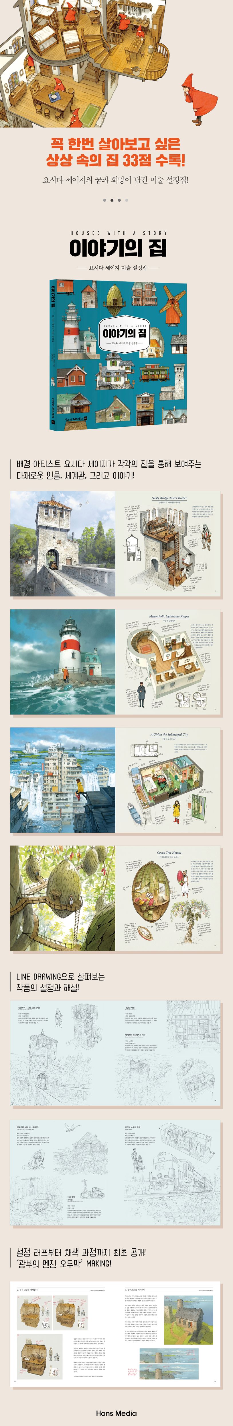 《이야기의 집》은 이야기 속 독특한 집과 그 설정을 그려내는 작업으로 유명한 배경 아티스트 요시다 세이지의 동인지 《이야기의 집Ⅰ·Ⅱ》의 결정판입니다. 기존의 《이야기의 집Ⅰ·Ⅱ》에 수록된 모든 작품은 물론, 새롭게 그린 15 작품, 만화식 그림책, 선화 갤러리, 작품 해설, 메이킹 등 처음 공개되는 내용도 한가득 수록하고 있습니다.