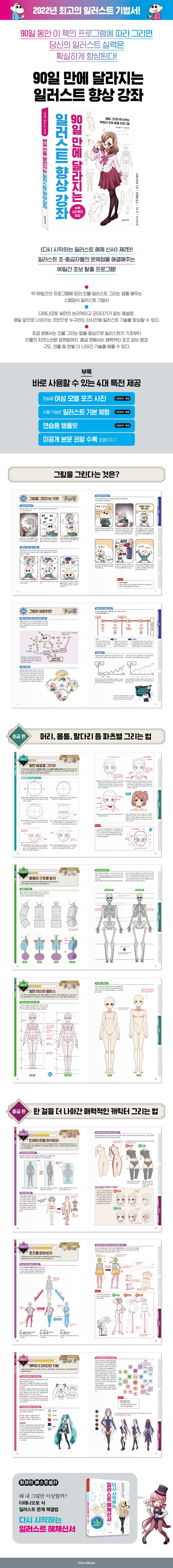 - 이 책은 약 90일간의 프로그램에 따라 인물 일러스트 그리는 법을 배우는 스텝업식 일러스트 기법서입니다. 1주일 중에 5일간의 레슨으로 원리를 배우고, 2일은 쉬는 프로그램으로 총 13주차로 이루어져 있습니다. 1일차부터 90일차까지 매일의 레슨이 진행됩니다.