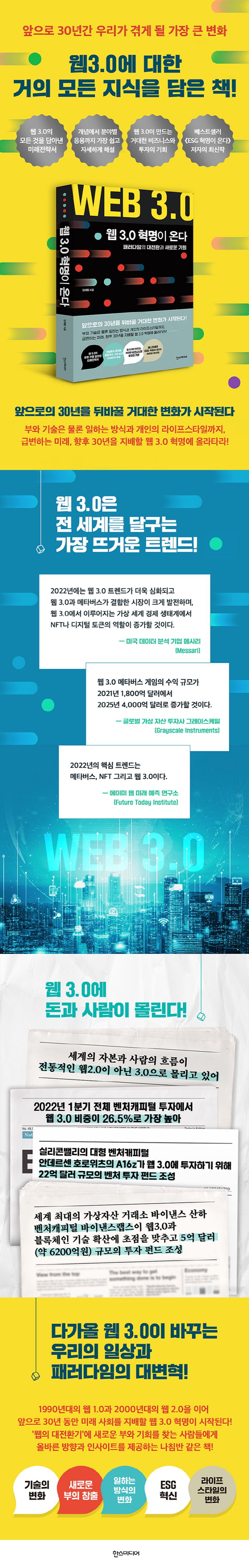 지금 세계의 기술과 자본, 인재는 메타버스에서 NFT를 지나 웹 3.0으로 이동하고 있다. 우리는 웹 3.0이라는 웹의 대전환기 속에서 발 빠르게 시장의 흐름을 읽고 기회를 포착해야 한다. 웹 3.0의 거품 논란은 계속되고 해결해야 할 과제는 많겠지만, 패러다임 빅뱅을 일으킬 웹 3.0은 분명하게 다가올 미래이다. 따라서 앞으로 다가올 웹 3.0 시대에 대비해 무조건적인 장밋빛 전망보다는 좀 더 객관적이고 알기 쉽게 웹 3.0을 전달하고 어떠한 미래 변화가 생길지 방향성을 제시해줄 ‘길라잡이’가 필요하다. 신간 《웹 3.0 혁명이 온다》는 개발자 관점에서만 논의되어 온 웹 3.0의 개념을 사용자인 대중의 관점에서 쉽게 해석하고 정리한 ‘웹 3.0 입문서’이자, 나아가 앞으로 다가올 웹 3.0 사회가 불러올 변화상을 짚어봄으로써 인플레이션, 금리 인상, 전쟁 등 불확실한 위기 상황을 헤쳐나갈 수 있도록 도와주는 ‘미래 준비서’이다.