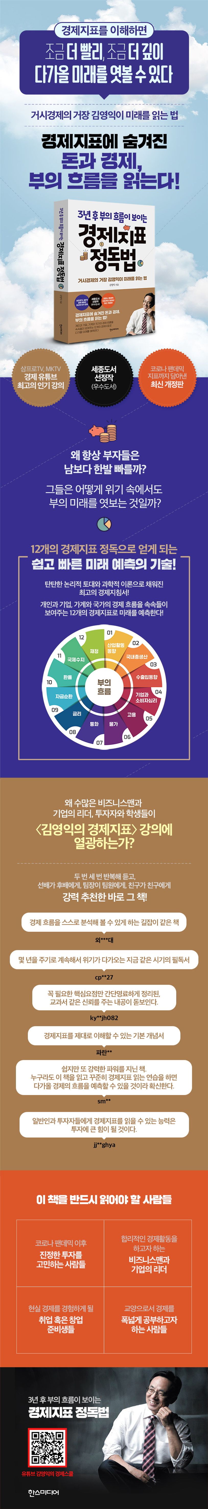 지난 2018년 발간 이후 오랜 시간 베스트셀러로 사랑 받아 온 대한민국 거시경제의 거장 김영익 교수의 《경제지표 정독법》이 최신 개정판으로 새롭게 선보인다. 우리 주위의 경제지표를 이용해 미래를 보는 법을 다룬 《경제지표 정독법》은 그간 비즈니스맨, 기업의 리더, 투자자, 그리고 사회초년생과 취업준비생에 이르기까지 경제를 보다 심도 깊게 이해하고 이를 현실에 활용하고자 하는 이들에게 큰 호응을 얻어왔다.