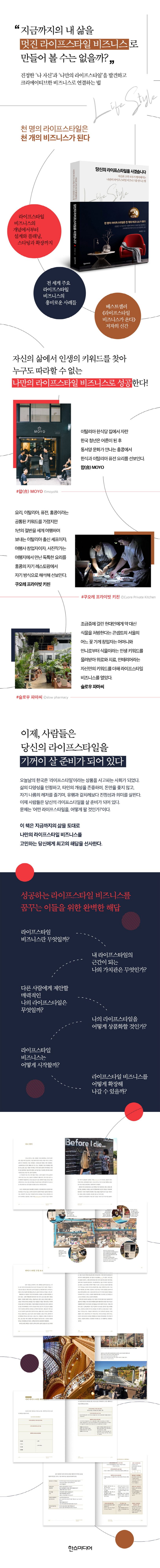 천 명의 라이프스타일은 천 개의 라이프스타일 비즈니스가 될 수 있다. 이 책은 지금까지의 삶을 토대로 세상에 없던 나만의 라이프스타일 비즈니스를 꿈꾸는 당신에게 최고의 해답을 선사한다.