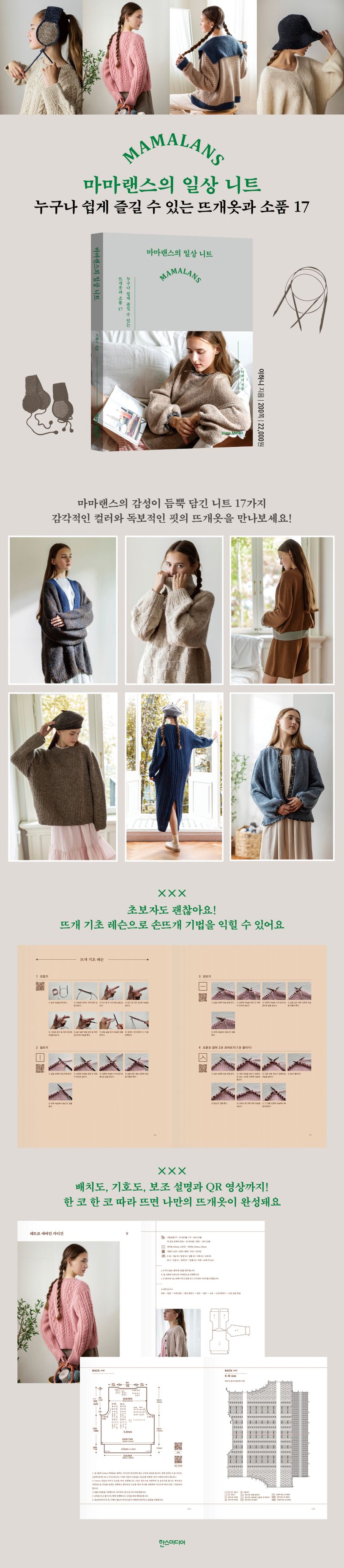 독특하면서도 빈티지한 느낌의 색상과 매일 입고 싶은 핏과 디자인으로 소문난 마마랜스의 니트! 인스타그램에 새로운 니트 작품을 올리면 도안 판매는 언제 시작하는지 문의가 쇄도한다. 공개하지 않았던 도안은 물론, 많은 사랑을 받았던 도안을 다른 형태로 변형해 17가지 아이템을 알차게 실었다. 뜨는 편물의 형태와 개수는 같지만 앞면 꿰매기에 따라 형태가 달라지는 클라우디 판초 & 카디건, 계절에 따라 다른 실로 만들면 사계절 즐길 수 있는 퐁퐁 폴카 닷 뷔스티에, 풀오버와 팬츠를 함께 또는 각각 입어도 멋스러운 플레이 울 셋업, 세일러 칼라로 사랑스러운 분위기를 물씬 풍기는 파트라슈 세일러 카디건, 코바늘로 근사하게 완성하는 버킷햇과 베레모 등 멋진 아이템을 가득 담아 완성 후 일상에서도 활용도가 높다. 니터들 사이에서 입소문 난 마마랜스의 디자인을 책으로 만나보자.