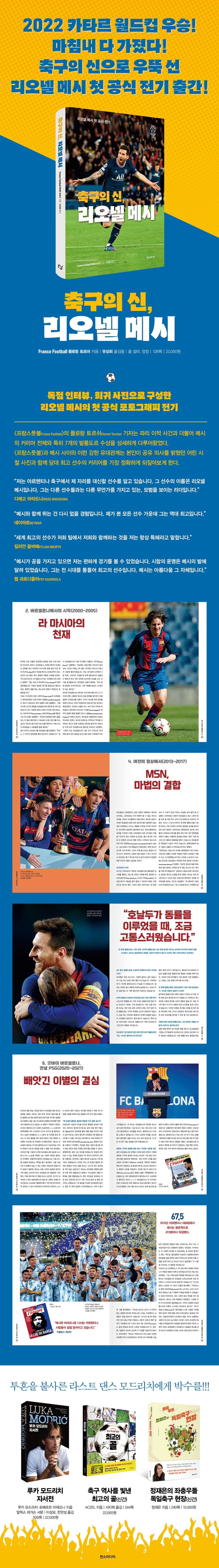 이 책은 메시가 축구를 처음 시작한 로사리오 시절과 바르셀로나 입단에 얽힌 비화는 물론 바르셀로나의 전성기를 이끈 MSN(메시, 수아레스, 네이마르) 시절 에피소드, 호날두와의 발롱도르 경쟁, 2021년 코파 아메리카 우승 과정, 마라도나와의 비교, 파리 생제르맹 이적 비화 등을 다루고 있다. 2022년 카타르 월드컵에서 아르헨티나를 우승으로 이끌며 세계 최고 축구 선수로서의 마지막 금자탑을 쌓은 리오넬 메시의 축구 인생을 이 책으로 확인할 수 있다.