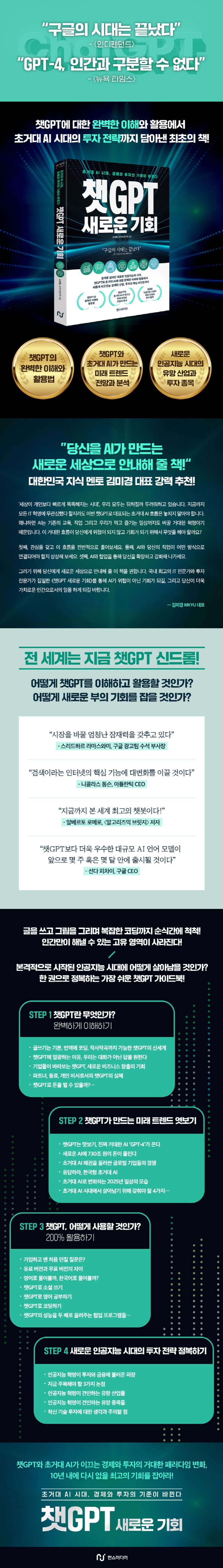 그러기 위해 당신에게 새로운 세상으로 안내해 줄 이 책을 권합니다. 국내 최고의 IT 전문가와 투자 전문가가 집필한 《챗GPT 새로운 기회》를 통해 AI가 위협이 아닌 기회가 되길, 그리고 당신이 더욱 가치로운 인간으로서의 일을 하게 되길 바랍니다.