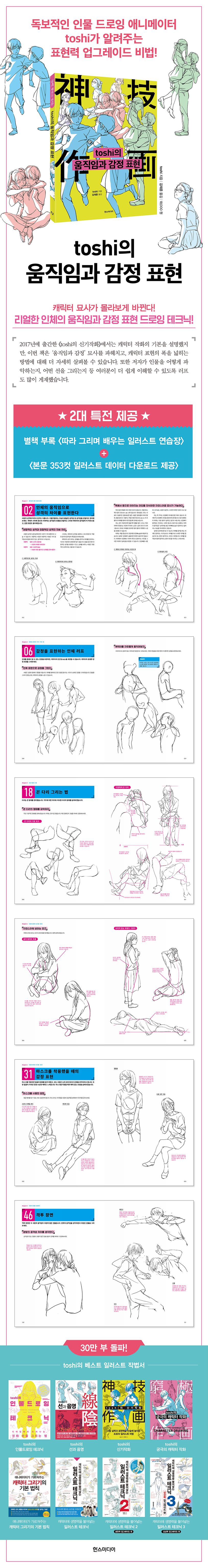 판매 누계 30만 부를 돌파한 인기 애니메이터인 toshi의 9번째 작법서. 이 책은 인물을 자세히 관찰하면서 인물 묘사는 물론이고 동작과 감정 표현을 어떻게 파악하는지, 어떻게 표현하면 좋은지를 함께 배우는 내용이다. 《toshi의 신기작화》에서는 캐릭터 작화의 기본을 설명했지만, 이번 책은 ‘움직임과 감정’ 묘사를 파헤치고, 캐릭터 표현의 폭을 넓히는 방법에 대해 더 자세히 살펴볼 수 있다.