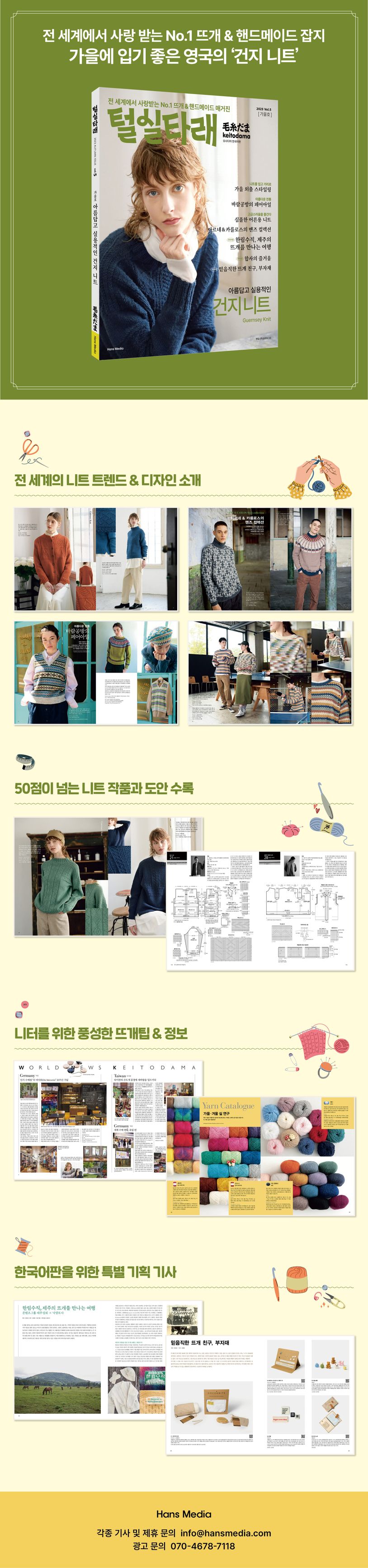 이번 호의 주제는 아름다운 영국의 건지 니트! 뜨기 쉬우면서도 입기 편해 가을이면 손이 가는 건지 니트를 소개합니다. 이에 더해 고급스러운 어른용 니트, 아르네 & 카를로스의 남자 니트, 바람공방의 페어아일, 귀여운 베이비 니트, 코바늘로 뜨는 소품과 가을 외출을 위한 의류까지 가득합니다. 그 외에도 포르투갈, 독일 등 세계의 손뜨개 소식과 과거의 수예, 유용한 뜨개 팁까지 담았습니다.