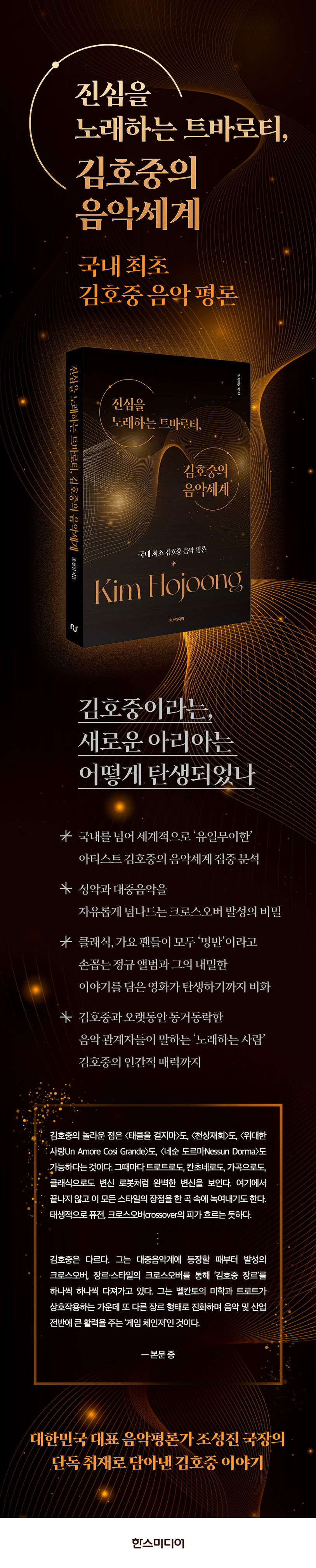 조성진 저자는 “짧은 시간 동안 완성도 높은 성인가요 앨범과 클래식 성악 앨범을 동시에 발표하는 등 여타 가수들과는 다른 행보를 거침없이 보여주고 있는 그에 관해 꼭 한번 자세히 다루고 싶었다”고 집필 배경을 밝히며, 그간 잘 알려진 적 없던 김호중의 음악적 성취를 집중적으로 분석했다.