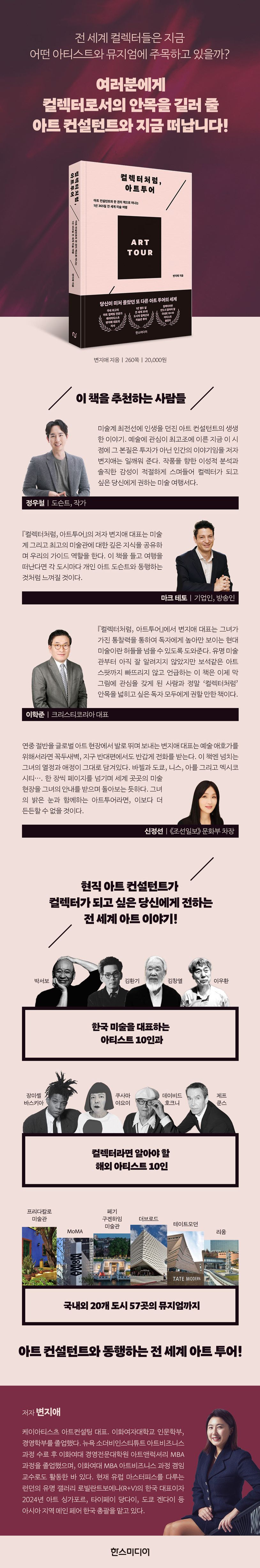 2022년 아시아 최초의 프리즈 아트페어가 서을에서 열린다고 했을 때, 평소 미술 시장에 관심을 두던 사람들은 놀라움을 금치 못했다. 2003년 런던에서 처음 시작되어 세계 미술계에서 손꼽히는 행사로 자리 잡은 이 아트페어가 아시아에서 처음으로 열리는데, 그 장소가 홍콩이나 일본 등 서구 컬렉터들에게 보다 더 익숙한 나라들이 아니라 한국이었던 것이다. K-POP이나 영화, 드라마뿐만 아니라 미술계에서도 한국 문화의 입지가 얼마나 더욱 단단해졌는지 실감할 수 있는 계기가 된 2022 프리즈 서울에는 그러한 의미와 기대에 부합할 정도로 많은 관람객들이 모였다. 미술품 감상과 컬렉션은 이제 더 이상 여행지에서의 특별한 일정이나 소수의 사치스러운 취향에만 국한되지 않는다. 예전보다 훨씬 많은 사람들이 미술계에 관심을 갖고 나름의 컬렉션도 구성해 보고 싶어 한다. 그러기 위해서는 ‘안목’을 기르는 게 무엇보다도 중요한데, 케이아티스츠의 대표이자 아트 컨설턴트인 『컬렉터처럼, 아트투어』의 저자 변지애는 자신의 첫 저서인 이 책에서 그러한 점을 강조하고 있다.
