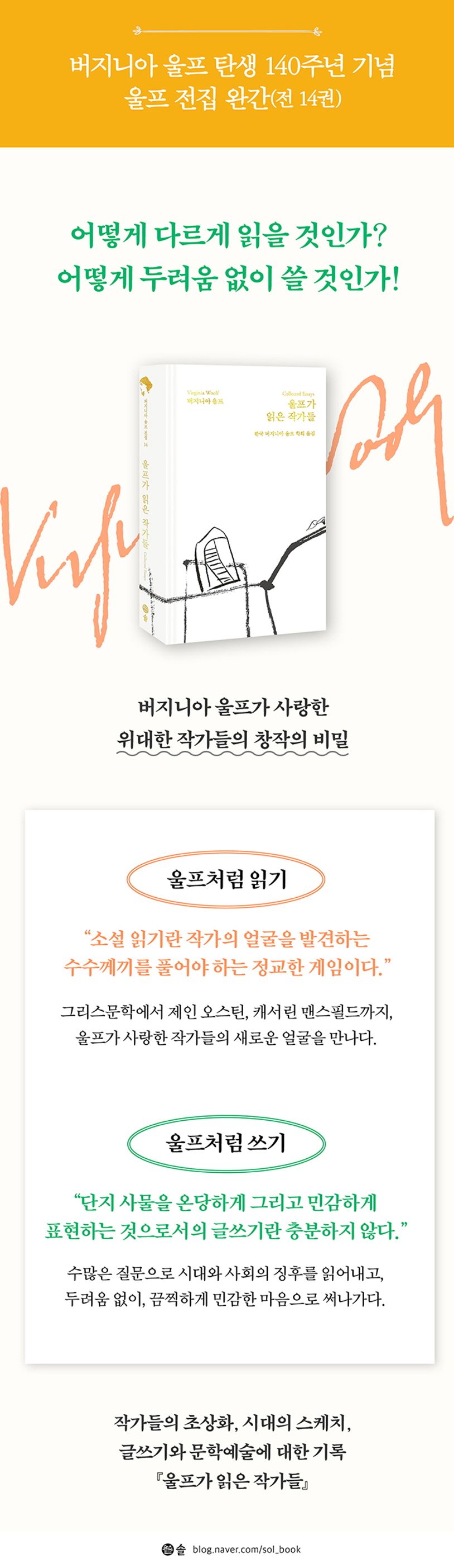 이번에 전집의 완결작으로 펴내는, 『울프가 읽은 작가들』에서는, 그리스 고전에서 현대 작품들까지 울프의 또 다른 문학 글쓰기를 통해 울프가 얼마나 치열하게 읽고 쓴 작가인지 여실히 느낄 수 있다. 이를 통해 울프의 작품 안에 문학의 길고 두터운 시간의 겹들이 작동하고 있음을 확인할 수 있으며, 울프가 무수한 작가들과 작품들을 읽으며 자신의 문학 세계를 어떻게 만들어나갔는지 생생하게 느낄 수 있다.