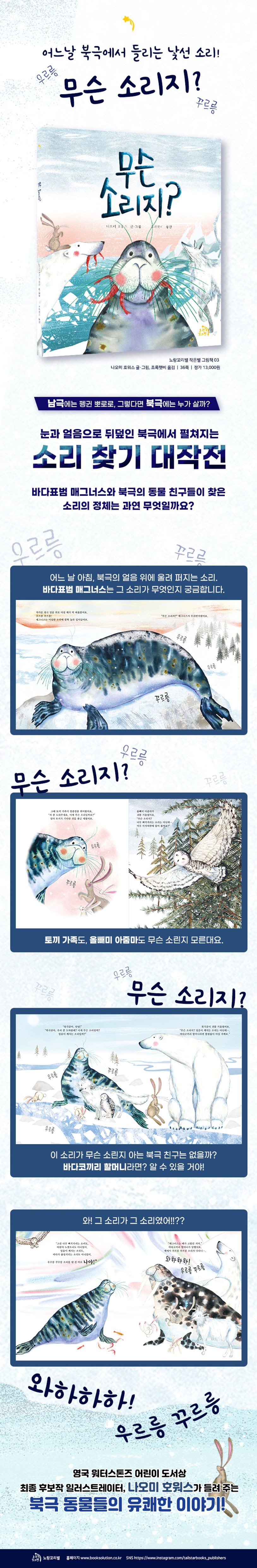 지구의 가장 남쪽에 위치한 남극, 남극 하면 떠오르는 동물이 있다. 바로 펭귄이다. ‘뽀로로’라는 유명 인사도 있다. 그렇다면 북극은 어떤가? 북극을 대표하는 동물은 북극곰이다. 북극곰 외에도 바다표범, 북극여우, 북극토끼, 흰올빼미 등이 살고 있다. 하지만 북극곰 외의 북극 동물이 논픽션이나 도감이 아닌 그림책에 등장하는 경우는 흔치 않다. 이렇게 많은 북극 동물을 단 한 권의 그림책에서 볼 수 있다니….