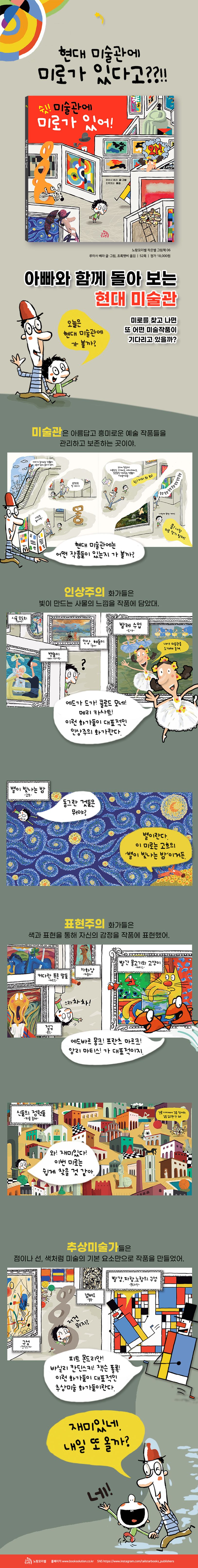 미술관에 간 아빠와 아이는 전시실을 둘러보며 플랩을 열고, 미로를 찾아가며 자연스럽게 현대 미술을 이끌어온 대표 예술 작품들을 만난다. 플랩(날개)으로 구성된 그림을 펼치면 우리가 아는 인상주의, 입체파, 추상미술 작품들이 마치 전시실처럼 나타나는데, 작품을 감상하는 동안 현대 미술이 어떻게 변화했는지, 작가들은 어떤 이야기를 그림에 담았는지 쉽게 설명해 두었다. 그다음 장은 현대 미술 거장들의 명화로 구성된 미로다. 인상주의, 후기 인상주의, 표현주의, 입체파, 초현실주의, 추상 미술, 팝 아트 등 일곱 개의 미로를 찾아가는 재미가 쏠쏠하다.