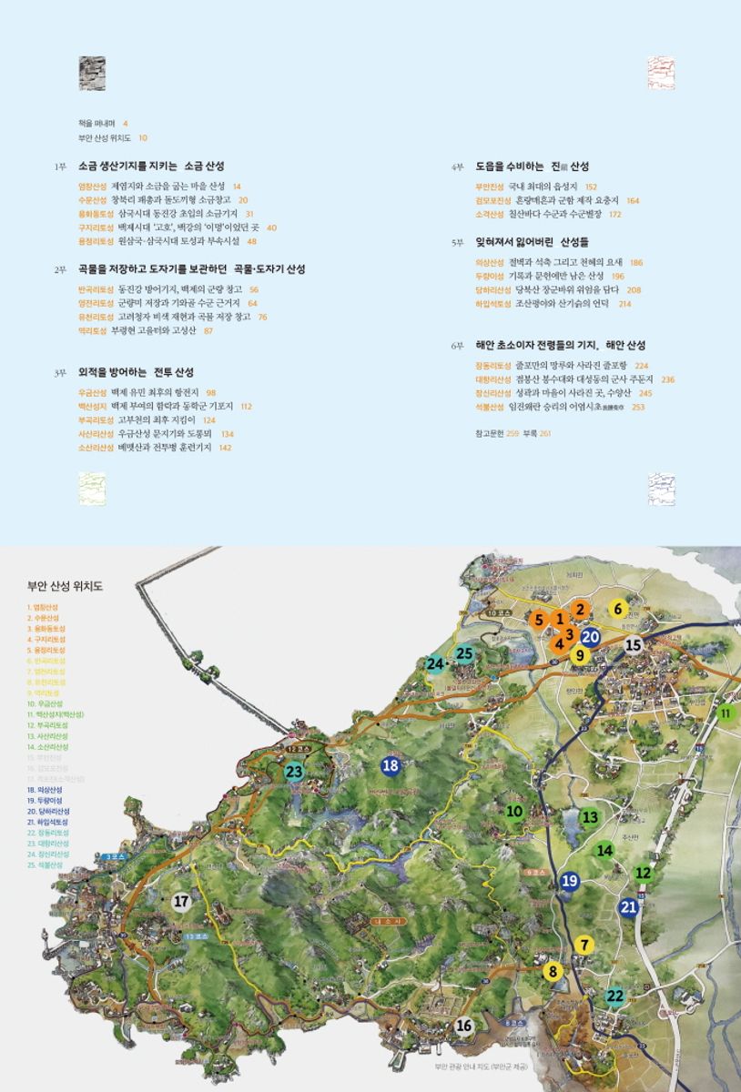 부안 산성은 다양하다. 해안가, 강가, 갯벌과 접한 낮은 구릉지에 밀집하여 마을 생활권과 가까운 산성이 많다. 백제 부흥군의 마지막 항거지이자 고려 말과 임진란의 왜구를 방어하던 산성도 제법 높은 곳에 있다. 부안에서는 토성과 석성, 퇴뫼식과 포곡식, 중심지의 읍성과 해안가의 산성을 다 볼 수 있다. 책은 25곳 산성들을 5가지로 구성하여 강가 구릉지와 바닷가 산이라는 독특한 지리와 방어기지로서 역사성을 함께 살핀다. 갯벌의 제염지 옆에 소금 저장을 겸했던 ‘소금 산성’, 호남평야에서 거둔 곡식을 보관하고 고려청자가 났던 ‘곡물·도자기 산성’, 나당연합군과 왜구를 막기 위한 ‘전투 산성’, 도읍의 역할을 했던 ‘진鎭 산성’, 그리고 바닷길의 전초기지였던 ‘해안 산성’이다. 이에 더하여 저자가 새롭게 확인한 산성을 ‘잊혀져서 잃어버렸던 산성들’로 따로 추렸다. 산성 아래 마을의 유래와 당산제, 인물들에 대한 인문지리 정보도 풍부하다. 파노라마로 전모를 담은 산성의 계절 이미지들은 이 책의 백미이다.