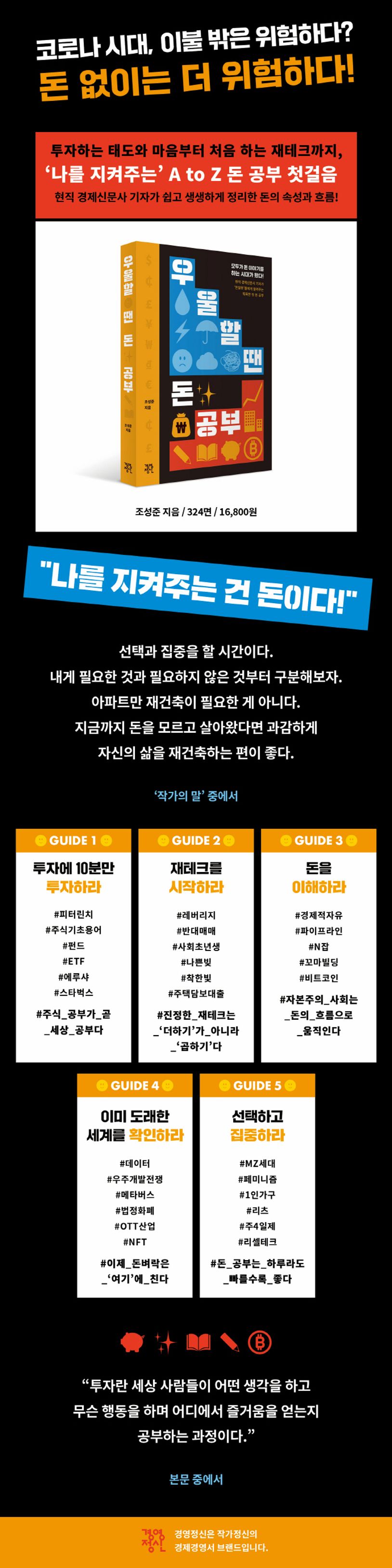 재테크서는 왠지 어렵게 느껴져서 그간 멀리했다면, 그리고 무엇보다 ‘돈알못’에서 하루빨리 탈출하고 싶다면 이 책과 함께 지금 시작해보자. 나도 돈을 벌 수 있다는 용기와 확신을, 나아가 세상을 바라보는 한 뼘 더 성장한 안목을 갖게 될 것이다.