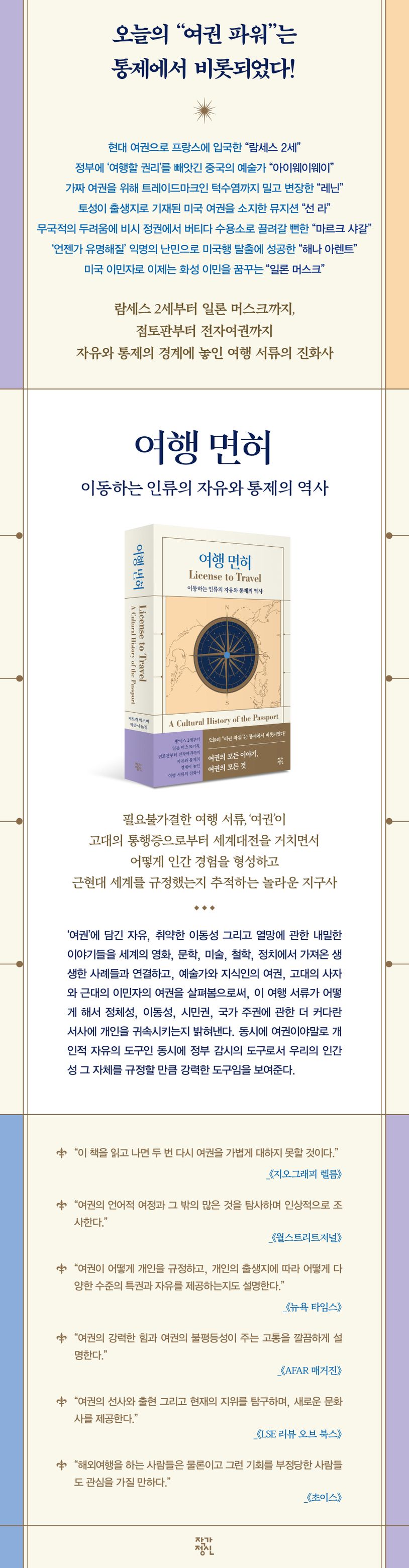 「여행 면허」는 여권에 담긴 자유, 취약한 이동성 그리고 열망에 관한 내밀한 이야기들을 세계의 영화, 문학, 미술, 철학, 정치에서 가져온 생생한 사례들과 연결하고, 예술가와 지식인의 여권, 고대의 사자와 근대의 이민자의 여권을 살펴봄으로써, 이 여행 서류가 어떻게 해서 정체성, 이동성, 시민권, 국가주권에 관한 더 커다란 서사에 개인을 귀속시키는지 밝혀낸다. 동시에 여권이야말로 개인적 자유의 도구인 동시에 정부 감시의 도구로서 우리의 인간성 그 자체를 규정할 만큼 강력한 도구임을 보여준다. 더불어 여권 제도의 근본적인 불평등 문제가 오늘날 야기하는 각종 국제적 위기를 되짚는다.