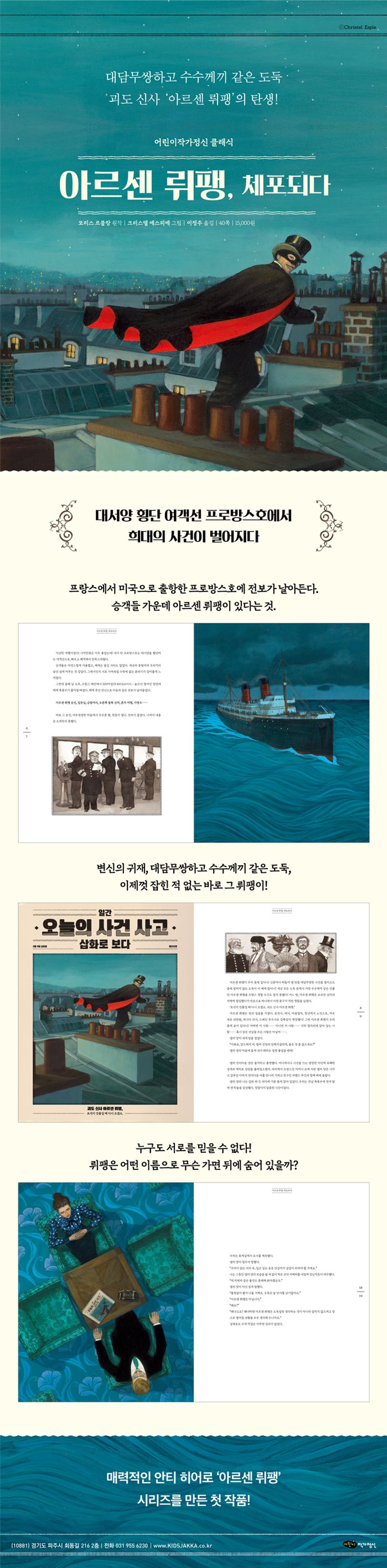 어린이작가정신 클래식 시리즈로 소개하는 『아르센 뤼팽, 체포되다』는 모리스 르블랑의 첫 ‘아르센 뤼팽’ 작품인 단편소설을 쉽게 접할 수 있도록 그림책으로 소개합니다. 각색과 그림을 맡은 크리스텔 에스피에는 고전 작품을 화려하고 아름답게 표현하여 극찬을 받고 있는 그림 작가입니다. 천의 얼굴을 가진 변신의 귀재, 아르센 뤼팽이 그의 손에서 새롭게 태어납니다. 클래식 그림책으로 만나는 아르센 뤼팽, 그는 과연 어떤 모습으로 누구의 가면 뒤에 숨어 우리를 지켜보고 있을까요?