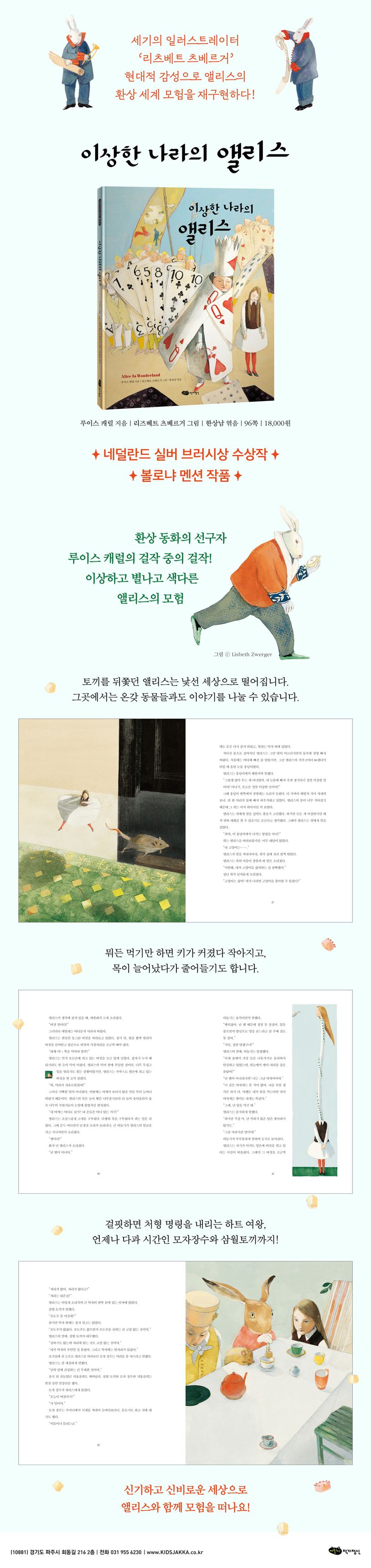 1865년에 발표된 뒤 지금에 이르기까지 수많은 연구와 해석이 이어지고 있으며, 영향을 미치지 않은 분야가 없다고 해도 좋을 만큼 관심과 사랑을 받는 작품이 바로 『이상한 나라의 앨리스』입니다. 20세기 이후 최고의 일러스트레이터로 평가받은 리즈베트 츠베르거가 그린 앨리스의 세계를 소개합니다. 리즈베트 츠베르거가 그린 『이상한 나라의 앨리스』는 네덜란드 최고 권위의 아동 문학상인 ‘실버 브러시상’을 수상했으며, 출간 이듬해 볼로냐 아동 도서전에서 언급되었습니다.