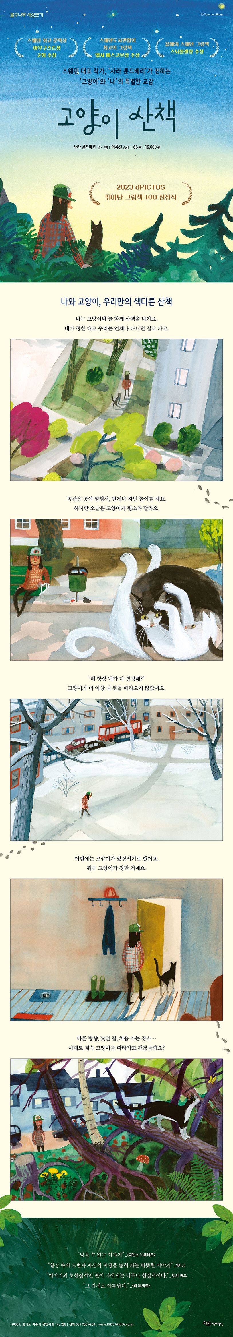 이번에는 고양이가 앞장서기로 합니다. 다른 방향, 낯선 길, 처음 가는 장소……. 이대로 계속 고양이를 따라가도 괜찮을까요? 서로의 차이를 받아들이고 맞춰 나가는 일, 한길을 함께 걷는다는 것은 인내심이 필요할 수도 있습니다. 하지만 친숙하고 눈에 익은 길이 아니라 새로운 길, 낯선 일을 할 용기를 내는 것은 모두 함께하려는 마음 때문입니다. 상대를 믿고 상대의 입장에서 바라보았을 때, 상대를 따라 일상을 벗어났을 때 얻을 수 있는 것도 있지요. 일상 속의 환상 세계를 특유의 독창적인 시선과 풍성한 색감으로 아름답게 묘사하는 사라 룬드베리의 세상 속에서 고양이와 나눈 특별한 우정과 교감, 이해와 사랑을 느끼며 함께 산책길에 나서 봐요.
