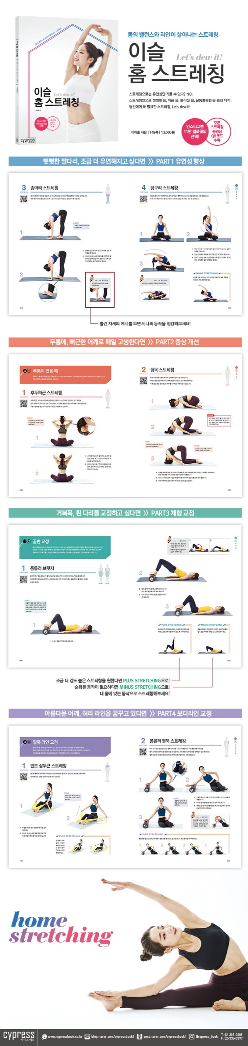 기본 동작에서 더 강한 자극과 스트레칭이 필요한 사람은 플러스 스트레칭, 기본 동작을 하기에 버거운 사람은 마이너스 스트레칭으로 자신의 몸에 맞는 건강한 스트레칭을 할 수 있도록 구성했다. 각 스트레칭 동작마다 저자가 직접 시연하는 스트레칭 동영상 QR 코드가 수록되어 있어 몸의 밸런스와 라인이 살아나는 스트레칭을 누구나 쉽게 따라 할 수 있도록 했다.
