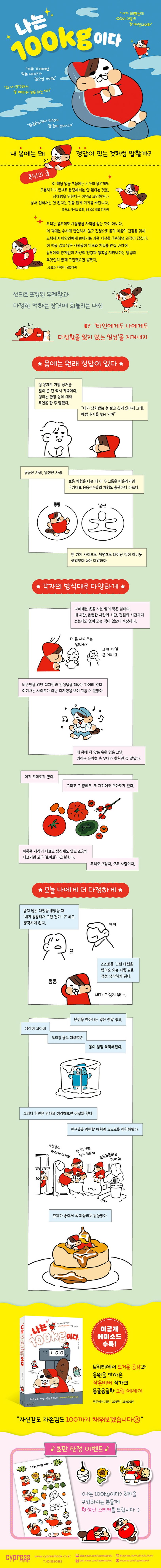 과체중이든 저체중이든, 키가 작든 크든 선의로 포장된 무례함과 다정한 척하는 조언에 완전히 자유로운 사람은 없다. 〈나는 100kg이다〉는 따뜻한 그림을 그리는 작가, 작은비버가 남들과는 조금 다른 모습의 ‘비만인’으로 겪은 일상을 그려낸 에세이다. 처음 본 사람이 대뜸 ‘살이 빠지는 다이어트 방법’을 알려주거나 가족과 주변 사람들이 ‘다 너 생각해서 살 빼라는 말을 하는 거지’라는 걱정 어린 조언을 할 때의 경험과 생각을 녹여낸 그림이 2021년 트위터에서 뜨거운 공감과 응원을 받았고, 이후 24편을 연재하는 동안 3만 회 이상 리트윗이 되며 크나큰 화제를 불러일으켰다.