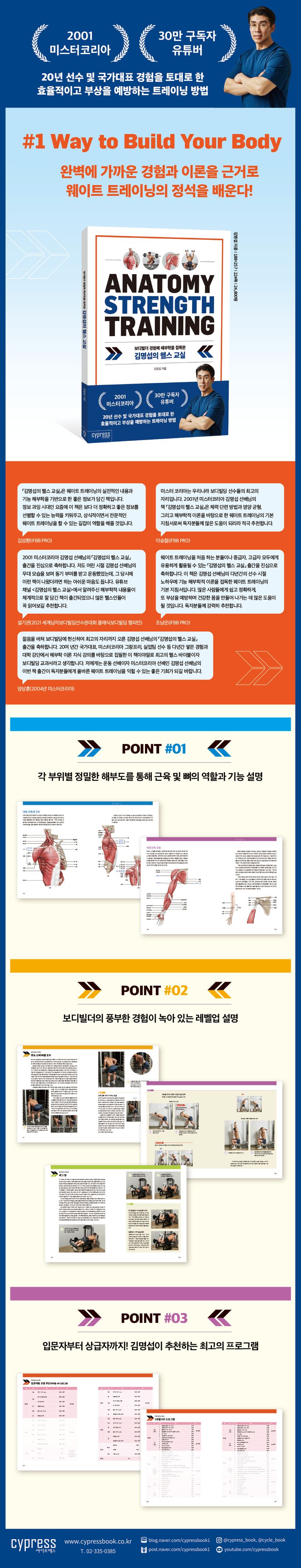 〈김명섭의 헬스 교실〉은 미스터코리아 1위이자 아시안 게임 보디빌딩 국가대표 출신인 저자가 20여 년간 직접 해온 운동방법에 해부학적 지식을 접목하여 최대한 부상을 방지하고 몸을 잘 만들 수 있는 웨이트 트레이닝 방법을 소개한다. 수많은 사람들이 건강을 위해서 운동을 하지만 아이러니하게도 오히려 잘못되거나 무리한 방식으로 인해 심각한 부상을 당하거나 건강에 해로운 경우가 많은 게 현실이다. 하지만 이 책은 운동 초보자는 물론 오랜 기간 운동을 해온 사람들 모두에게 필요한 정보를 담고 있어 부상 없이 건강한 몸을 만드는 것이 가능하다. 이 책은 가슴, 등, 어깨, 팔, 복근, 하체 등 각 부위별로 정밀한 해부도를 통해 근육 및 뼈의 역할과 기능을 설명하고, 원 조인트와 투 조인트 등 관절에 관한 이해도를 높이는 등 해부학적 지식을 제공한다. 그리고 해부학적 지식을 바탕으로 체계적이고 효율적인 웨이트 트레이닝 방법을 소개한다. 또한 각 운동 별로 다양한 팁과 주의사항 등을 제공하여 성과는 최대화하고 부상은 최소화하는 데 많은 도움을 준다. 마지막으로 이 책에 소개한 운동법을 활용하여 초보자부터 경력자까지 모두 활용할 수 있는 강력한 프로그램을 제공한다.