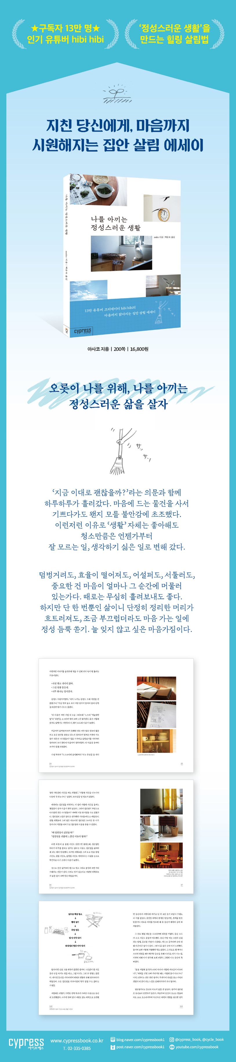 이런 생각을 하고 있는 사람이라면 이 책을 통해 ‘정성’이란 무엇인지, 나에게 기울이는 ‘정성’이란 어떤 형태인지 저마다의 ‘정성’을 발견하는 계기가 될 것이다. ‘생활’ 자체를 감사히 여기며 ‘지금’에 온 마음을 쏟는 것이 바로 ‘나를 아끼는 정성스러운 생활’임을 말이다.