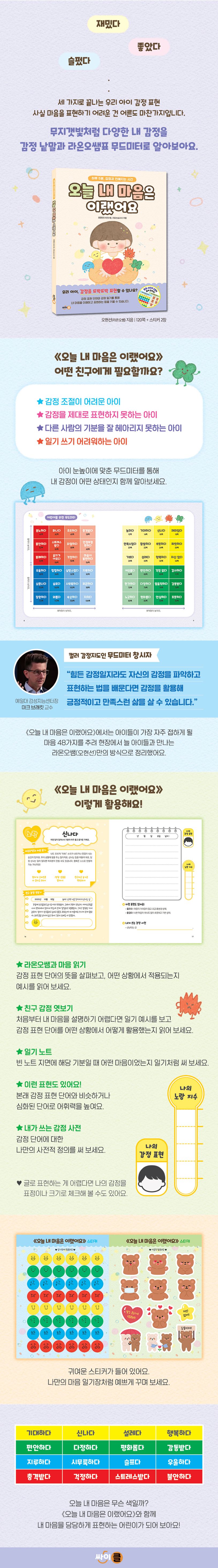 이 책은 25년간, 다양한 아이들에게 자신의 생각을 겉으로 드러낼 수 있도록 도왔던 논술교사 오현선 작가가 제임스 러셀의 무드미터를 아이들 눈높이에 맞게 재구성한 책이다. 그리고 각 감정에 따라 우리나라 아이들에게 걸맞는 새로운 정의와 예시를 들어 초등 저학년 독자가 쉽게 자신의 감정을 인지하고 헤아릴 수 있게 만들었다. 하루 5분에서 10분만 책을 펼쳐 그날의 감정을 찾아 감정 뜻을 파악하고 일기처럼 자신의 생각을 써 본다면 감정이 나타나게 된 원인을 이해할 수 있다. 또한 감정에 휘둘리지 않고 조절하는 힘이 커지게 될 것이다.