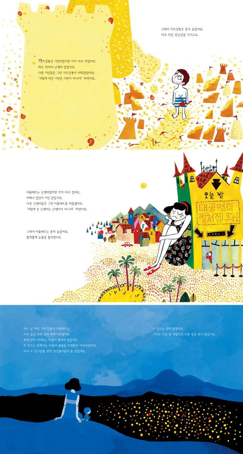 거인 나라의 가장 작은 거인 가르강통과 난쟁이 나라의 가장 큰 난쟁이 미몰레트는 각자의 나라에 어울리지 않는 외모 때문에 차별과 따돌림을 받으며 외롭게 지냅니다. 그러던 어느 날, 우연히 만난 둘은 서로의 상처를 보듬으며 세상에서 가장 친한 친구가 되죠. 그리고 자신들을 있는 그대로 받아들여 줄 곳을 향해 떠나게 됩니다. 힘들 때나 슬플 때나 서로를 위로하고, 악몽에 시달리는 밤을 같이 견뎌낸 그들은 마침내 반짝이는 마을에 도착하게 됩니다. 더도 말고 덜도 말고 ‘가르강통’과 ‘미몰레트’로 살 수 있는 마을을 찾게 된 것이죠.