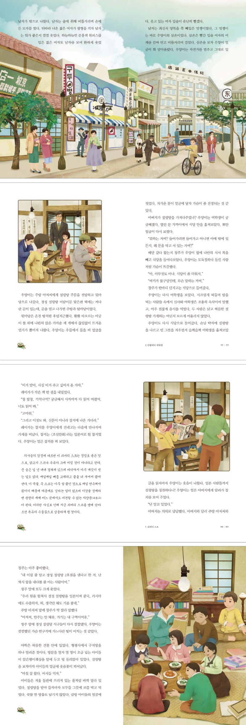 이러한 설렁탕에 대한 흥미로운 사실과 경성 설렁탕 가게 사람들의 이야기를 녹여 낸 『1930, 경성 설렁탕』은 백정의 아들로 태어난 우양이가 고난을 겪으며 자신을 둘러싼 세상을 깨닫는 성장 소설이다. 또한 경성 설렁탕을 운영하며 백정들의 권리를 위해 형평 운동을 펼치는 우양이 아버지, 쓰러져 가는 토막촌에 살면서도 웃음을 잃지 않는 창주, 우양이를 괴롭히는 부잣집 아들 동규 등 다양하고 입체적인 인물들을 통해 1930년대 일제의 지배 아래 살아갔던 우리 민족의 삶을 생생하게 파헤친다. 우양이가 배달하며 지나치는 신문물이 가득 찬 종로 거리 풍경과 생활상은 글과 그림으로 생동감 있게 재현되어, 그 시대로 돌아간 것 같은 느낌을 준다.