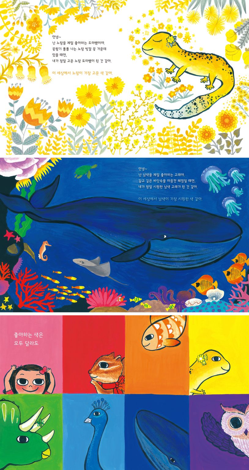 세상 모든 것이 핑크였으면 좋겠다고 할 만큼 핑크를 좋아하는 아이가 있어요. 어느 날 이 아이 앞에 여러 동물 친구들이 나타납니다. 빨간 열매를 좋아하는 다람쥐, 주황 비늘로 치장한 금붕어, 노랑 꽃밭에 앉은 도마뱀, 초록 풀밭에 앉아 쉬는 공룡, 파랑 깃털을 뽐내는 공작 등 저마다 좋아하는 색을 자랑하지요. 동물 친구들이 자랑하는 색들은 저마다 정말 멋졌어요. 근데 더욱 놀라운 것은 동물 친구들이 좋아하는 예쁜 색들이 아이가 좋아하는 핑크와 어우러지자 더욱더 근사하고 아름다운 빛깔을 만들어 내지 뭐예요!
