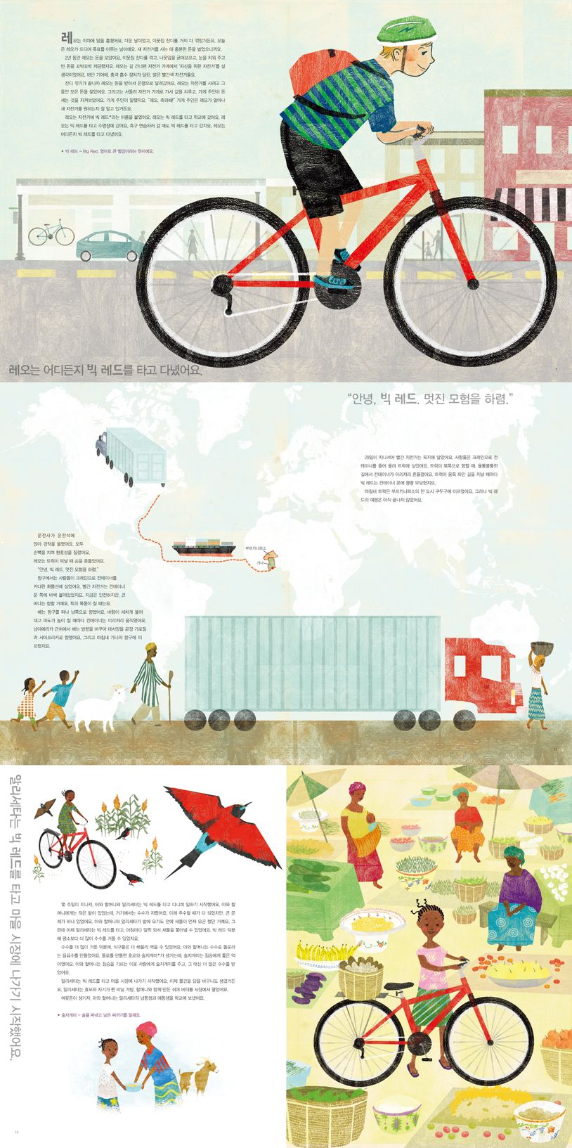 전 세계 여러 나라에는 형편이 어려워 자전거를 살 수 없지만, 학교에 갈 때, 환자를 나를 때, 물건을 팔러 갈 때 등 생활에 자전거가 꼭 필요한 사람들이 있습니다. 이 책은 레오라는 한 소년이 자신이 아끼던 빨간 자전거 “빅 레드”를 기부 단체를 통해 기부하고, 서아프리카의 한 소녀 알리세타에게 전달되면서 시작되는 빨간 자전거의 놀라운 활약과 함께 나눔과 기부의 가치를 담고 있습니다.