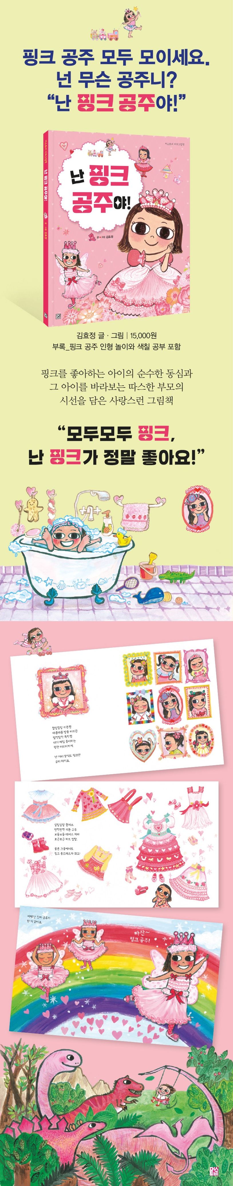 *예쁜종이인형과색칠놀이가포함되어있어요.핑크공주모두모이세요.핑크공주가사랑한책,“난핑크공주야!”“모두모두핑크,난핑크가정말좋아요!”주인공여자아이는요정지팡이,장난감자동차,토끼인형같은장난감은물론이고무시무시하고커다란공룡조차도핑크공룡이라상상하며좋아합니다.아이는핑크머리핀을머리에꽂고핑크원피스를입고핑크리본구두를신고나면짜잔~하고핑크공주로변신합니다.변신을마친핑크공주의하루는어떨까요?핑크공주가된아이는똑똑하게엄마말씀을잘기억합니다.진짜공주가되기위해서는공주다운마음과행동이필요하다는것을요.그래서위험한곳에서는조심조심하고,맘에들지않는다고무조건울고떼쓰지않죠.그리고친구들과어울려놀때도착하고예쁜마음으로양보할줄알고,음식을먹을때도깔끔하고예의바르게행동합니다.핑크와함께한행복한하루를마친핑크공주는이번에는사랑스런핑크곰돌이와함께핑크꿈나라로여행을떠납니다.그런데핑크공주가핑크보다더좋아하는게뭘까요?그건바로엄마아빠랍니다.“엄마아빠사랑해요.핑크보다더많이요!”핑크를너무나좋아하는여자아이의무한한상상력을보여주는이야기이책은어린시절핑크에푹빠진딸을길렀던저자가이제는훌쩍자라버린아이를바라보면서,‘내아이가과연그때무슨생각을했을까?’하고과거를추억하면서지은이야기입니다.보통의여자아이라면핑크에푹빠져지내는시기를한번쯤지나옵니다.그럴때아이들의행동을유치하고철없는어린아이들의조악한취향쯤으로여기고,다른색을강요하거나아이의취향을부정하고비난하는어른들도있습니다.하지만아이들은무언가에몰두하고그안에푹빠져있을때,남들이미처생각하지못한멋진아이디어를생산하고,어려운문제를해결하며,창의성과상상력을발휘하여세상을보는시야를넓히게됩니다.따라서이책은아이들의핑크세상을그들의시선으로함께바라봐주고,그세상을만든아이의상상력을축복하고자하는마음을담고있습니다.또한자신만의세상을꿈꾸는우리아이들이책임감있는아이로예쁘게자랄수있도록안내합니다.즉,특별한사람이되고자할때,그에맞게행동하는동시에아름다운마음가짐을가져야한다고넌지시일러주지요.내아이는어떤빛깔의세상을꿈꾸고있을까?단지핑크색만이아니라모든아이들은자신만의색깔로고유한세상을꿈꾸고상상합니다.그리고주변친구들의취향에도관심을보이며점차정체성을확립해나가지요.그렇다면내아이는과연어떤색으로어떤세상을만들어가고있을까요?지금내아이가걸어가고있는길에엄마아빠가동행하면서관심으로지켜보고있는지돌아볼시간입니다.지구상의모든동식물들이햇볕을받아야만생명을유지하며건강하게성장하듯이,아이들은이세상그무엇보다엄마아빠가보내주는깊고풍부한사랑의빛을받아야행복하게자랄수있습니다.이책을읽은모든아이들이엄마아빠의애정과응원을듬뿍받으며자신의행복한세계를마음껏꿈꾸고,더넓은세상으로나갔을때다른사람을행복하게만드는존재로자라기를바랍니다.