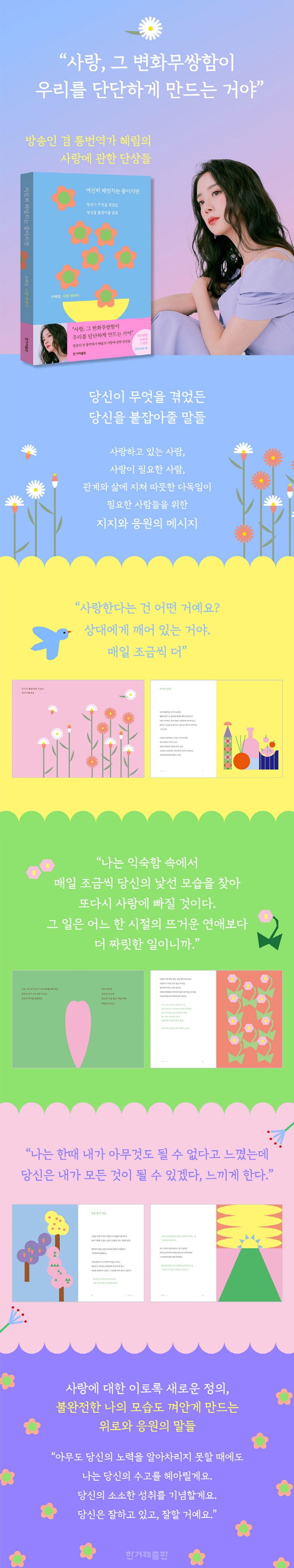 이 책은 원더걸스 출신의 방송인 겸 통번역가 혜림이 쓴 첫 에세이이다. 치열한 아이돌 세계를 거쳐 통번역가의 길을 택하고, 진로도 사랑도 ‘온전히 자신이 주인이 되어’ 찾아나간 우혜림 작가에게 삶은 ‘헤엄쳐나가는 과정’이다. 건강하고 밝은 영감을 주는 행보로 많은 여성들의 사랑을 받고 있는 작가는 “우리의 삶이 어떻게 펼쳐질지 모르지만, 그럼에도 매일 용기 낼 수 있다. ‘함께’라고 말할 수 있는 사람들이 있으니까”라고 말하며, ‘사랑’의 가치를 이야기한다. 이 책에는 사랑하고 있는 사람, 사랑이 필요한 사람, 관계와 삶에 지쳐 따뜻한 다독임이 필요한 사람들을 위한 지지와 응원의 메시지들이 가득하다. 사랑의 희열과 고통에 고스란히 감응하며 써내려간 이 문장들은, 사람을 치유하고 일으켜 세우는 말의 위력을 실감하게 한다. 작가는 ‘무너져 내린 상황에서도 큼지막한 미소를 짓게 만드는 말’, 평범한 일상 속에서도 ‘현실을 초월해 사는 듯한 행복을 만끽하게 하는 말’ 등을 세밀하게 기록했다. 노래 가사 같기도, 시 같기도 한 감성적이고 힘 있는 문장들이, 설렘과 위로가 필요한 이들의 가슴을 강하게 어루만진다.