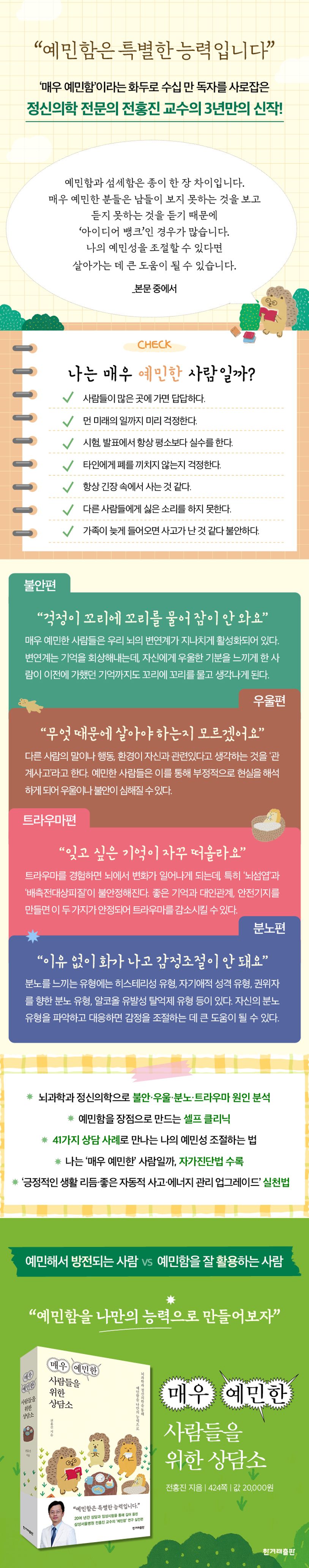 첫 책 《매우 예민한 사람들을 위한 책》으로 4대 서점 베스트셀러 종합 1위에 오르며 수십 만 독자의 사랑을 받았던 전홍진 교수. 많은 독자의 성원에 힘입어 3년 만에 두 번째 책 《매우 예민한 사람들을 위한 상담소》를 출간했다. 이 책은 〈한겨레〉에 3년간 연재한 ‘예민과 둔감 사이’라는 상담 칼럼을 바탕으로 최근의 연구 성과들까지 담아낸 매우 예민한 사람들을 위한 ‘실전 편’이다. 전작에서 매우 예민한 사람들의 특징과 예민성을 잘 극복한 사람들을 소개하는 데 집중했다면, 이번 책에서는 예민함에 관한 뇌과학과 정신의학적인 근거를 좀 더 세밀하게 더하고, ‘예민함을 나만의 능력으로 바꿔보는’ 실천법에 방점을 두었다. 또한 불안편, 우울편, 분노편, 트라우마편으로 나누어 41가지 상담 사례를 살펴보며 예민함과 얽힌 여러 감정들의 원인을 깊이 있게 분석한다.