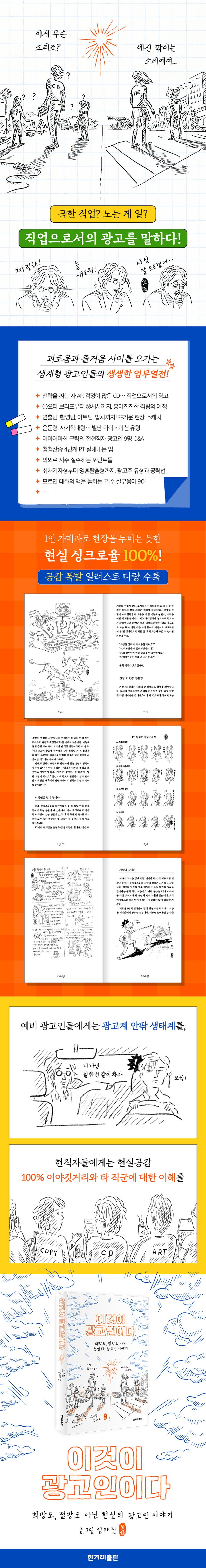 이 책은 히트 광고들을 다량 탄생시킨 제일기획 크리에이티브 디렉터(CD) 임태진의 첫 저작이다. 물리학과 디자인을 전공하고, 음악방송 연출 등 다채로운 경력을 가진 임태진 작가는, 그 경험들을 자양분 삼아 여러 타깃대를 공략한 화제의 광고들을 만들어내고 있다. 광고(인)의 세계를 글과 그림으로 재미있게 풀어낸 《이것이 광고인이다》를 집필하게 된 배경에는, 오랫동안 저연차 광고인들, 신입사원과 인턴들의 실무 교육을 도맡아 한 데 있다. 카피라이터, 아트디렉터, 촬영감독 등 광고일을 하고 싶어 하는 사람은 꽤 많지만, 그 일들에 대해 알지 못하는 경우가 대부분이다. 생각했던 일이 아니라며 어렵게 입사한 직장을 퇴사하거나 잘 적응하지 못해 연차가 쌓여가는 데도 곤란해하는 경우가 많다. 《이것이 광고인이다》는 광고일을 직업으로 삼고 싶은 사람들, 광고업계에 왔으나 현업에서 어려움을 겪는 사람들, 광고일에 호기심을 갖고 있는 사람들을 위한 책이다. 어떤 프로세스로 광고가 만들어지고 어떤 네트워킹과 노하우로 접근해야 더 원활히 일할 수 있는지, 광고인들의 희로애락은 무엇인지 유머러스한 글과 그림으로 전한다.