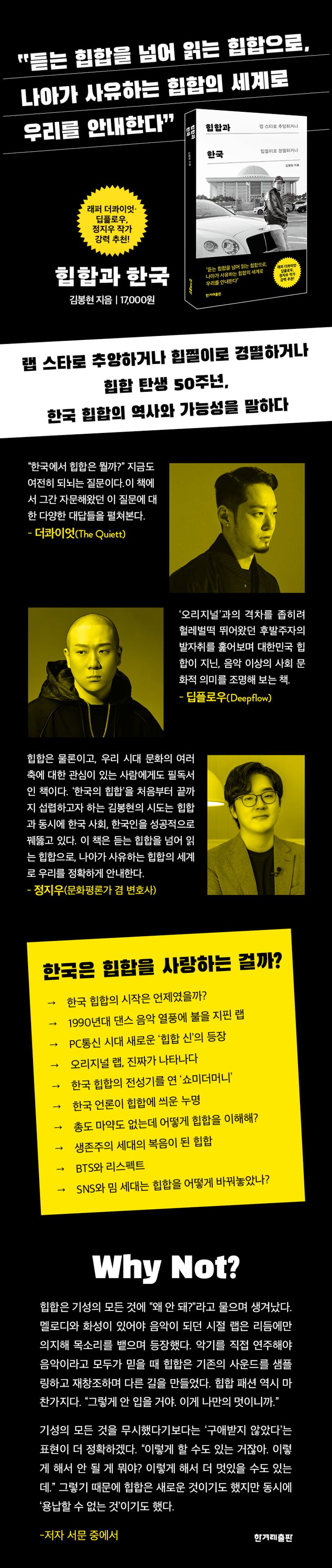 1990년대 pc통신 힙합 동호회와 클럽 마스터플랜 시대, 2000년대 새로운 실험과 랩 스타의 등장, 힙합 경연 프로의 인기, 그리고 마침내 한국 대중문화의 주인공이 된 힙합. 저자는 1990년대 초 한국 힙합의 태동기와 2000년대 본격적인 힙합 신 형성기를 거쳐 ‘쇼미더머니’와 함께 전성기를 맞았던 한국 힙합의 역사를 돌아보며, 힙합을 둘러싼 한국 사회의 여러 논쟁들에 대한 성찰을 풀어놓는다.