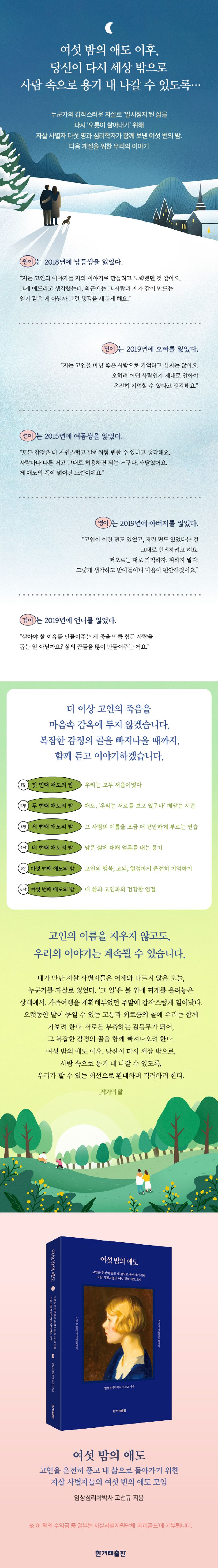 하루 평균 36.1명이 자살하는, OECD 자살률 1위의 오명을 안고 있는 한국. 2030 젊은 층의 자살률까지 크게 증가한 가운데, 11월 20일 〈세계 자살 유가족의 날〉을 맞아 한국에서 ‘세계 최초 유례없는 시도’를 한 책이 출간되었다. 한국의 대표적인 자살 사별 애도상담 전문가 고선규 임상심리학박사와 자살 사별자 다섯 명이 함께 만든 ‘애도 안내서’ 《여섯 밤의 애도》이다.
