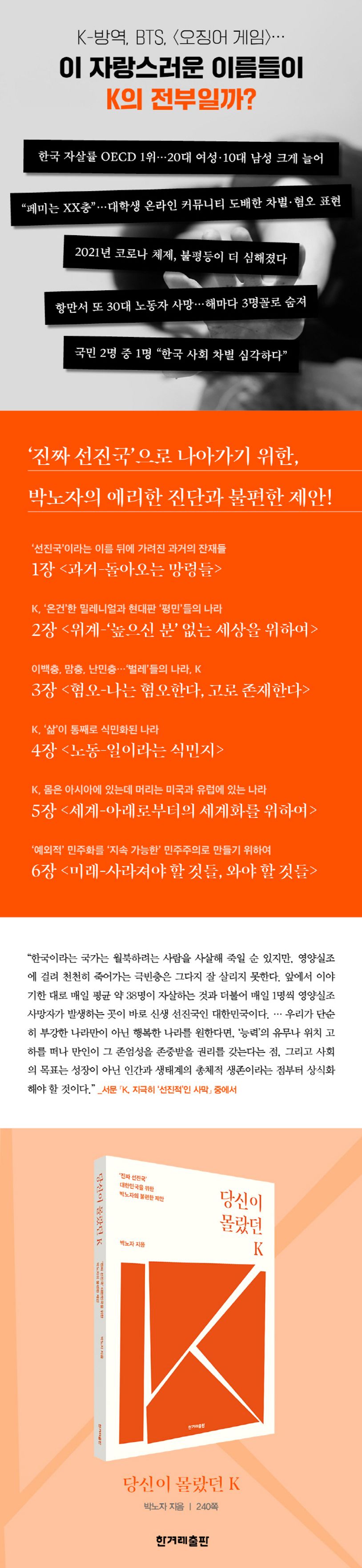 넷플릭스 세계 1위를 차지한 〈오징어 게임〉과 〈지옥〉으로 대표되는 K-콘텐츠, BTS와 블랙핑크 등 전 세계적으로 인기를 누리는 K-팝, 코로나19 바이러스 대응의 성공 사례로 꼽히는 K-방역…. 이렇듯 K는 이미 선진국이 된 한국의 자랑스러운 모습을 보여주는 말로 사용되고 있다. 하지만 경계인의 시선으로 한국의 모순과 부조리를 날카롭게 해부해온 박노자는 이 책에서 우리가 잘 모르거나 알면서도 외면했던 K의 불편한 진실을 직시한다.