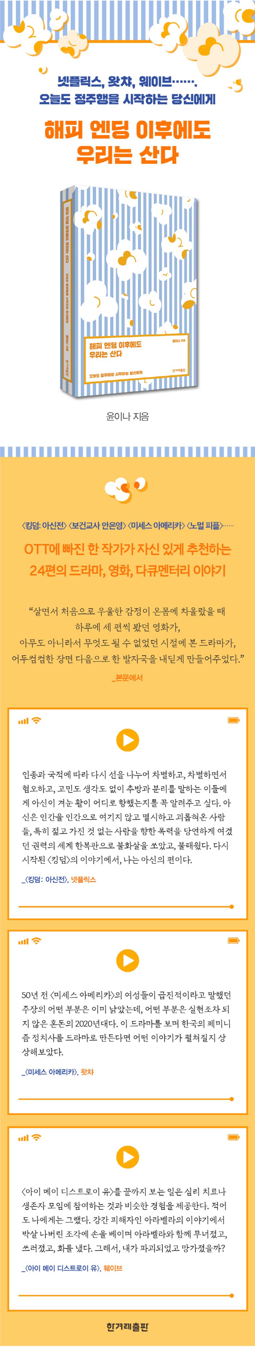 십여 년간 칼럼, 드라마, 에세이, 소설 등 이야기가 있는, 거의 모든 장르의 글쓰기에 매진해온 윤이나는 첫 책 《미쓰윤의 알바일지》와 두 번째 책 《우리가 서로에게 미래가 될 테니까》에서 밀레니얼 세대의 치열한 삶과 고투를, 《라면: 지금 물 올리러 갑니다》를 통해 1인 가구 세대주의 라이프스타일을 유쾌하게 그려냈다. 그에 대해 말할 때 우리는 ‘이야기’를 빼놓을 수 없는데, 그가 영화 〈빅쇼트〉를 통해 세계 금융 위기를 배우고, 드라마 〈용의 눈물〉로 조선 개국의 역사를 배우며, 다큐멘터리 〈익스플레인〉을 통해 돈의 흐름을 이해하는 “TV 키드”이기 때문이다. 《해피 엔딩 이후에도 우리는 산다》는 저자가 2020년 여름부터 연재한 한국일보 〈김봉석, 윤이나의 정기구독〉 칼럼 중 가장 추천하는 OTT 작품을 선별하여 사람, 사랑, 삶의 주제로 묶고, 연재 지면에 미처 담지 못했던 개인의 이야기를 가감 없이 녹여냈다.