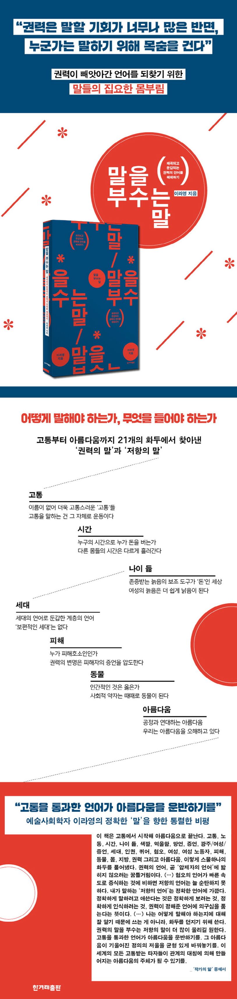 이 책은 한국 사회의 뜨거운 논제들을 치밀하고 날카롭게 다뤄오며, 시대를 통찰하는 저서를 집필해온 예술사회학자 이라영의 2년 만의 단독 저서이다. 지금 우리에게 가장 유의미한 화두 21개를 꼽고 그 속에서 우리가 무심코 사용하는 ‘권력의 말’과 ‘저항의 말’을 분석한다. 고통, 노동, 시간, 나이 듦, 색깔, 억울함, 망언, 증언, 광주/여성/증언, 세대, 인권, 퀴어, 혐오, 여성, 여성 노동자, 피해, 동물, 몸, 지방, 권력 그리고 아름다움에 대한 담론이 꼬리를 물듯 이어져 시대 흐름을 보여주는 거대한 ‘화두의 지도’를 구성한 점이 매우 새롭다.