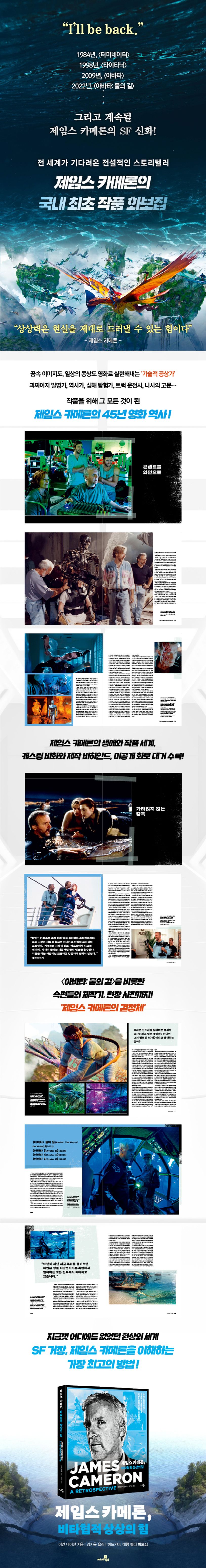 뛰어난 상상력과 실행력, 극단의 완벽주의와 집요함으로 작품을 세공해 나가며 영화인들의 무한한 존경과 시네필들의 사랑을 독차지해 온 제임스 카메론. 이 책은 공상과학영화를 닥치는 대로 섭렵하며 영화의 꿈을 키우던 유년 시절부터 캐릭터 구상과 캐스팅에 영향을 끼친 그의 변화무쌍한 사랑 이야기, 작품 하나하나의 탄생비화와 제작 비하인드, 비공개 화보까지 모두 담은 ‘제임스 카메론의 결정체’이다. 영화 뒤에 숨겨진 이야기들은 영화만큼이나 스케일이 거대하고 상상 이상으로 흥미진진하며, 제임스 카메론과 배우들이 현장에서 함께 고생한 모습이 담긴 사진과 미공개 스틸컷 들은 그 자체로도 보는 이들을 흥분시킨다. 특별히 〈아바타〉 이후 그가 보낸 13년의 고뇌의 시간에 대한 이야기와 〈아바타: 물의 길〉 다음으로 2028년까지 계속될 〈아바타 3, 4, 5〉의 제작기, 비화 등이 수록되어 있다는 점에서 더욱 소장 가치가 높다.