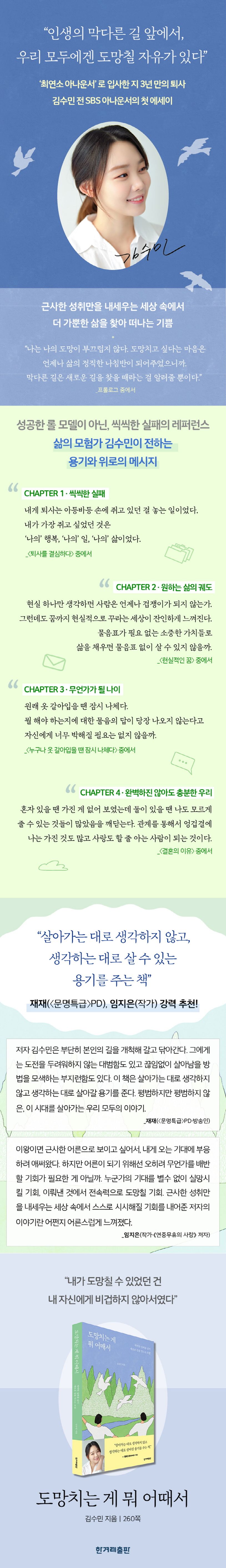 이 책은 독자에게 롤 모델이 되어주는 성공한 아나운서 이야기가 아니다. 저자의 씩씩한 실패와 도전이 하나의 레퍼런스가 되어 그와 나란히 선 독자에게 용기로 가닿는 책이다. 우리는 도망이 간절해지는, 크고 작은 좌절의 순간에도 내면의 감정에 귀 기울이기보다 다른 이의 기대나 기준에 부합하기 위해 애쓰고 감내한다. 그런 우리에게 “막다른 길 앞에선 용기 내어 자기 자신을 위해 도망칠 수 있으면 좋겠다”(11쪽)라고 힘주어 말하는 저자의 이야기는 그 자체로 용기를 심어준다. 또. ‘도망은 비겁한 행동이 아니라 오히려 스스로의 감정에 충실한 행동이며 자신 역시 기꺼이 실패하고 도망쳤기 때문에 조금씩 원하는 삶의 궤도를 찾을 수 있었다’는 솔직한 고백은, 실패에 대한 마음속 두려움을 깨뜨릴 뿐 아니라 틀에 박힌 성공만을 인정하는 사회의 경직된 잣대를 비튼다.