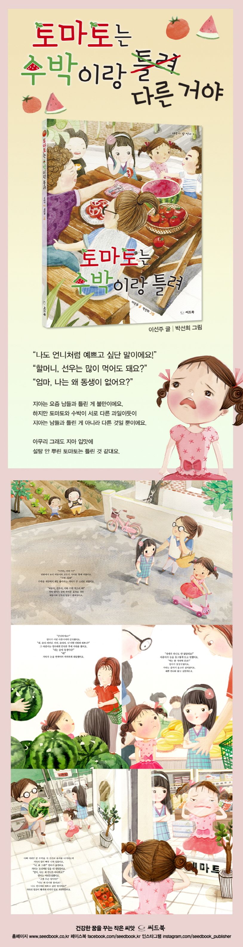 지아가 세상에서 가장 좋아하는 과일은 바로 수박이에요. 아삭하고 달큰하고 시원한 수박! 시큼하기만 하고 맛없는 토마토랑은 비교할 수 없이 맛있지요. 하지만 요새 지아한테 일어난 일들은 전부 ‘수박’이 아니라 ‘토마토’ 같아요. 예쁜 언니랑 하나도 안 닮았다는 소리를 듣질 않나, 수박 더 먹고 싶은데 여자는 조금 먹어야 한다고 하질 않나, 아기가 예뻐서 만지려고 했더니 태동이가 자기 동생 만지지 말라고 뭐라 하질 않나. 지아 입맛에 토마토는 수박이랑 틀린데……. 그렇다면 지아도 다른 사람들이랑 틀린 걸까요?