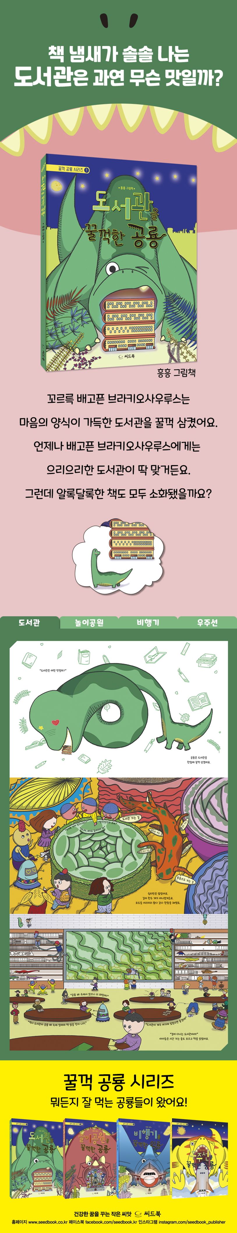 깜깜한 밤 꼬르륵 배고픈 브라키오사우루스는 맛있는 걸 찾아 헤맸어요. 그러다가 책 냄새가 솔솔 나는 도서관을 발견했죠. 공룡은 순식간에 도서관을 꿀꺽 삼켰어요. 다음 날 도서관을 찾아온 아이들은 온데간데없이 사라진 도서관을 찾아 헤매다 옆에 쿨쿨 잠든 공룡을 보고 알아차렸어요. 공룡이 도서관을 꿀꺽했다는 걸요! 과연 공룡 몸속 도서관은 모두 소화됐을까요?